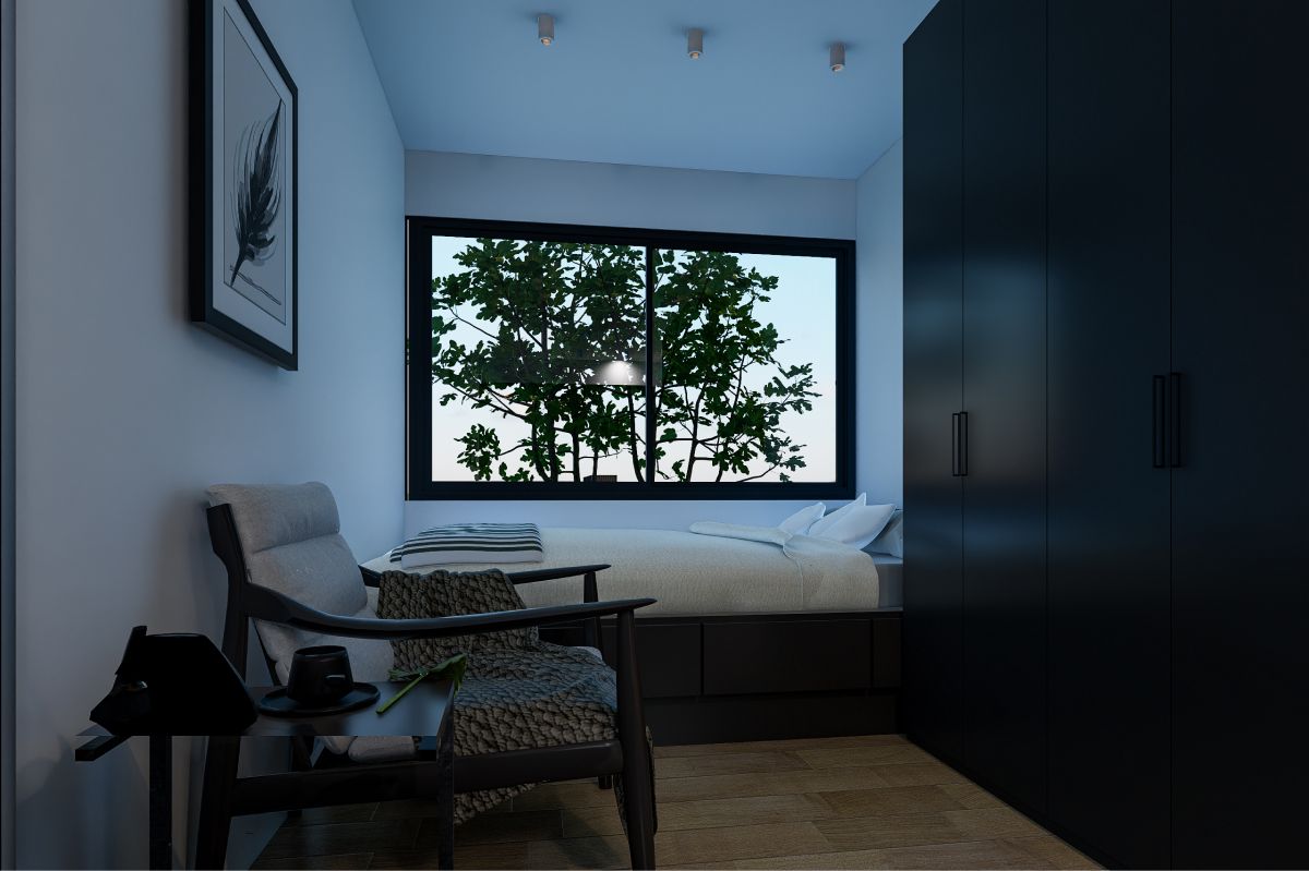 Inside, you'll find a cozy living area, kitchenette, smart-bed, and private bathroom - everything you need for comfortable, everyday living. A large window fills the interior with natural light, creating a bright and inviting atmosphere.